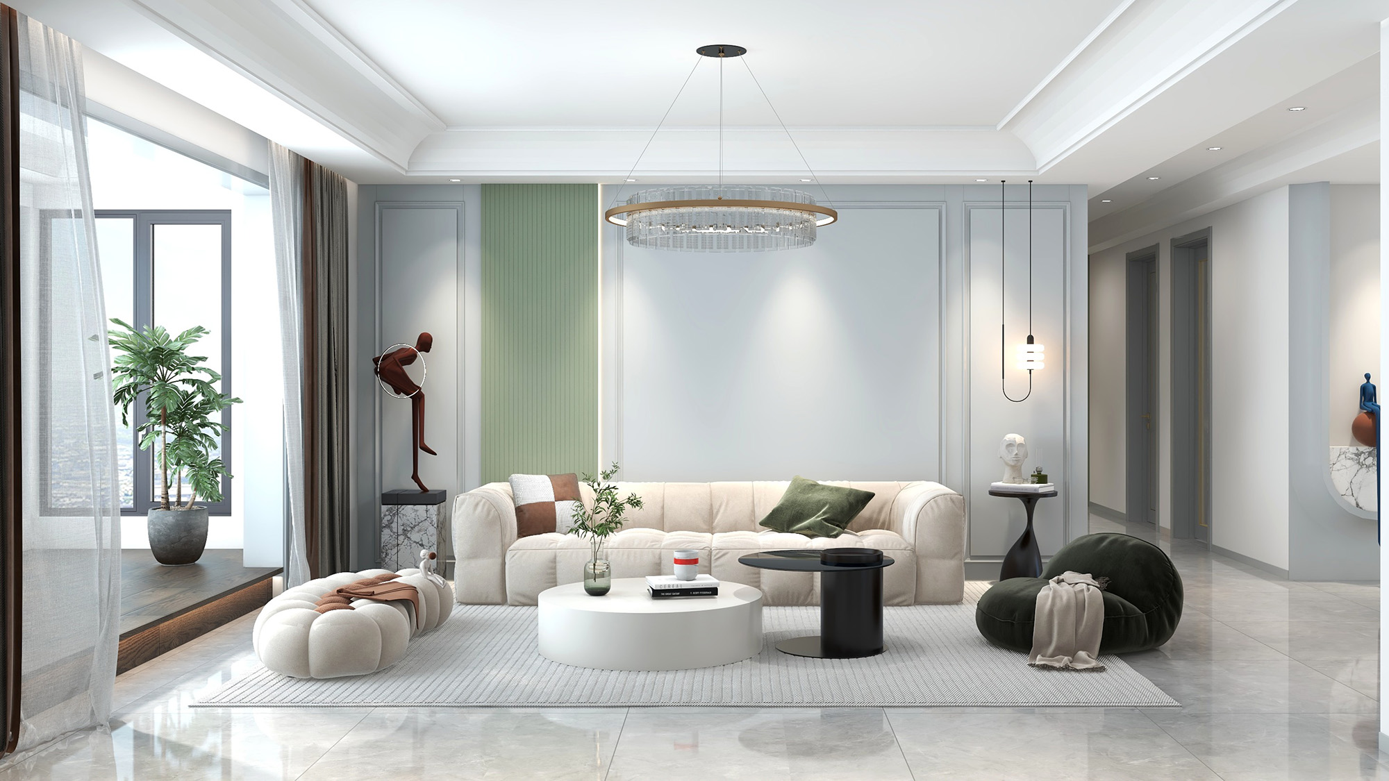 整体空间采用淡雅的简欧墙板,打造一个优雅的欧式轻奢主义空间。柔软的布艺沙发深浅不一 营造丰富的层次感。电视背景墙采用大理石地台打造 细腻的纹理散发的轻奢雅致的气息。